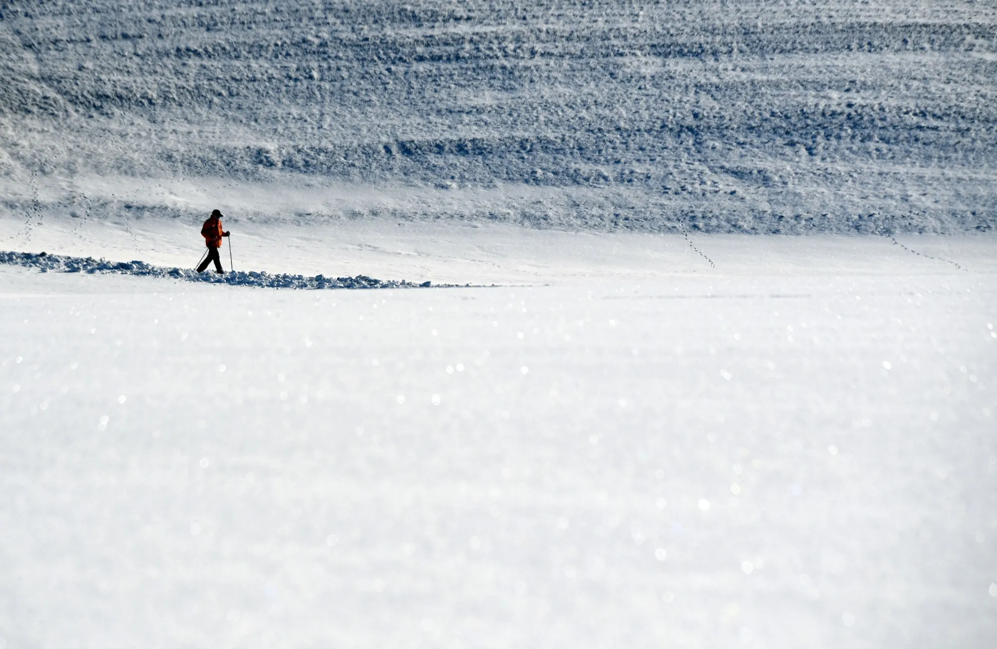 一名徒步旅行者在阿尔卑斯山前的雪地中行走。