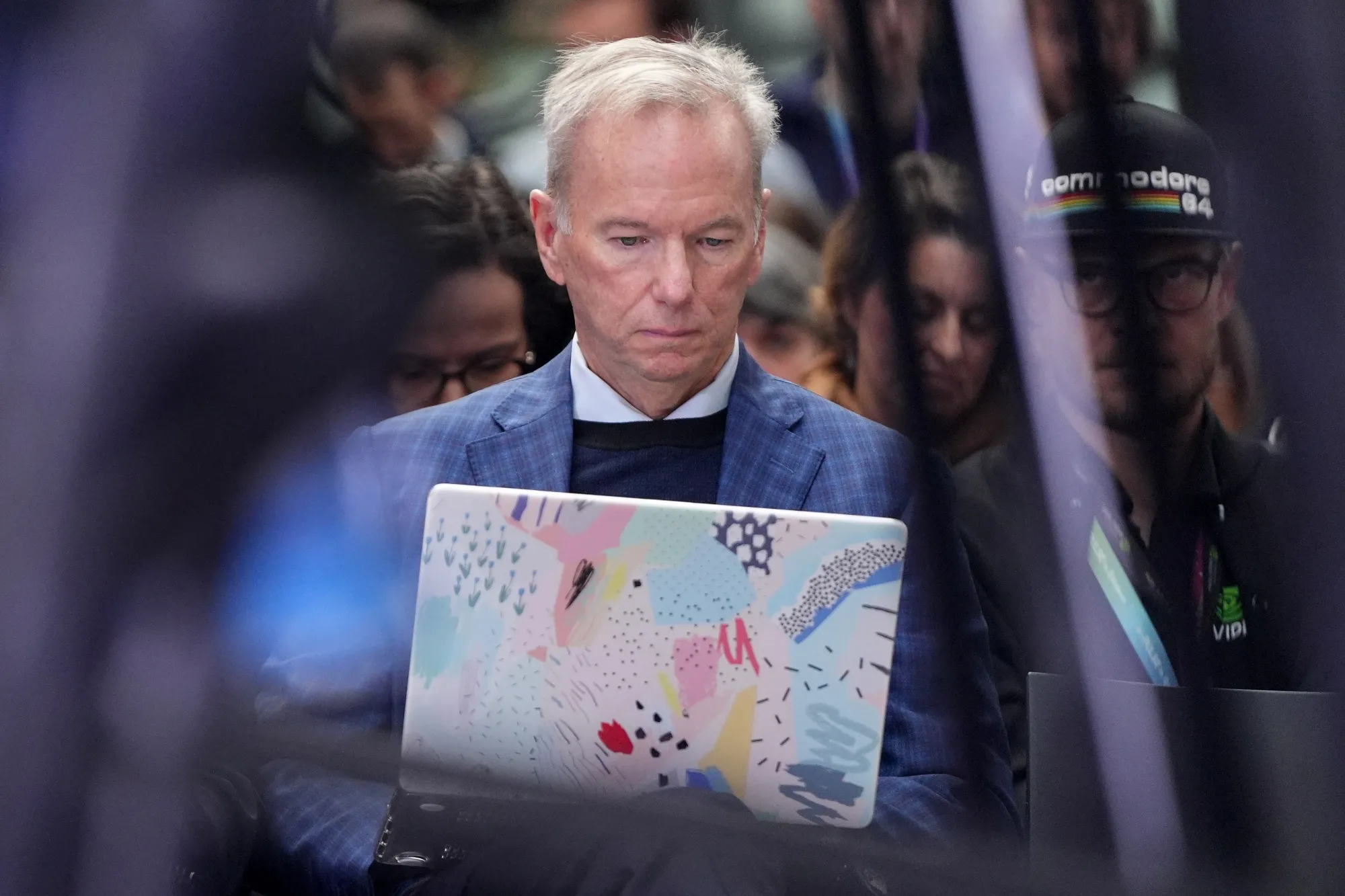 埃里克·施密特,亿万富翁和施密特未来公司的联合创始人,在巴黎Station F科技园区的ai-Pulse会议上使用笔记本电脑。摄影师:内森·莱恩/彭博社施密特曾担任五角大楼顾问委员会主席,他在一篇2023年的评论文章中写道,“无情的AI驱动的神风特攻队无人机群”是战争的未来。在今年早些时候斯坦福大学的一次演讲中,施密特表示,他在看到俄罗斯坦克摧毁乌克兰公寓楼后,受到启发开始了他的公司。