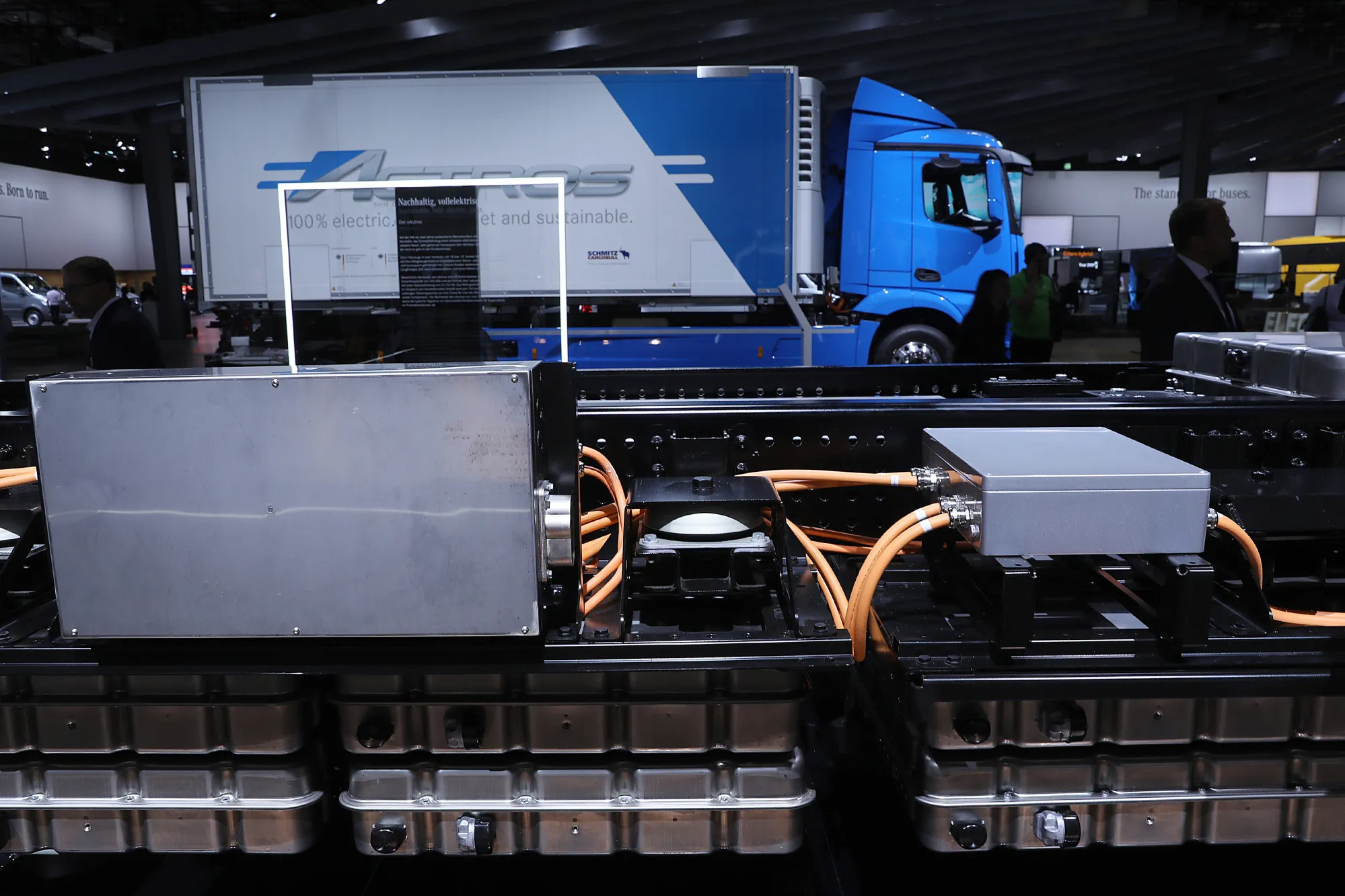 汽车电池组和电动驱动系统在德国汉诺威的IAA商用车展上与梅赛德斯-奔驰e-Actros电动运输卡车一起展出。