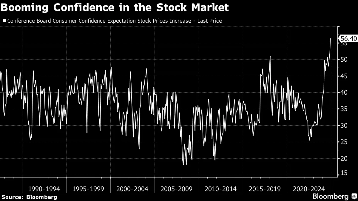 美国银行这是另一张惊人的图表,也是美国银行提到的。这是来自会议委员会的消费者信心调查,显示了认为股票会上涨的受访者的百分比。