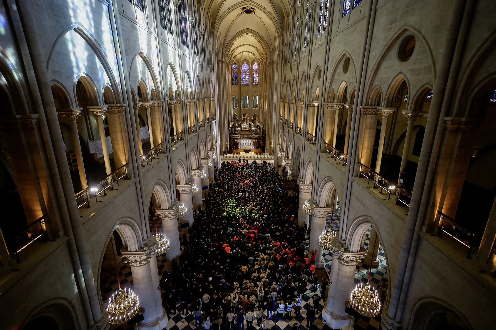 法国总统埃马纽埃尔·马克龙在巴黎圣母院的中殿向聚集的人群发表讲话,圣母院将在本周末重新开放,五年前曾遭遇毁灭性火灾。摄影师:SARAH MEYSSONNIER/法新社**有新闻线索吗?**你可以通过 [email protected] 联系Margi Murphy。你也可以使用我们的 SecureDrop 安全匿名地发送文件给我们。