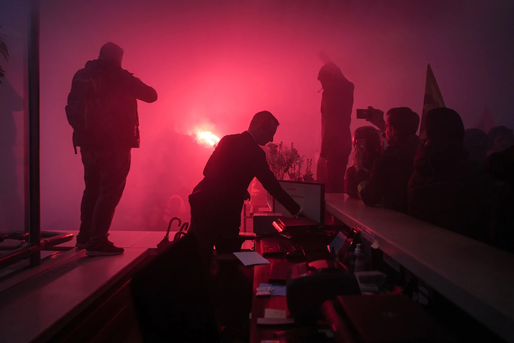 一名员工在抗议者进入LVMH总部期间保护接待台,抗议者是在巴黎进行养老金改革示威。摄影师:内森·莱恩/彭博社今年6月,马克龙做出了导致他衰退的错误决定——为了在勒庞的政党在欧盟选举中大获全胜后重新获得控制权而召集提前选举。