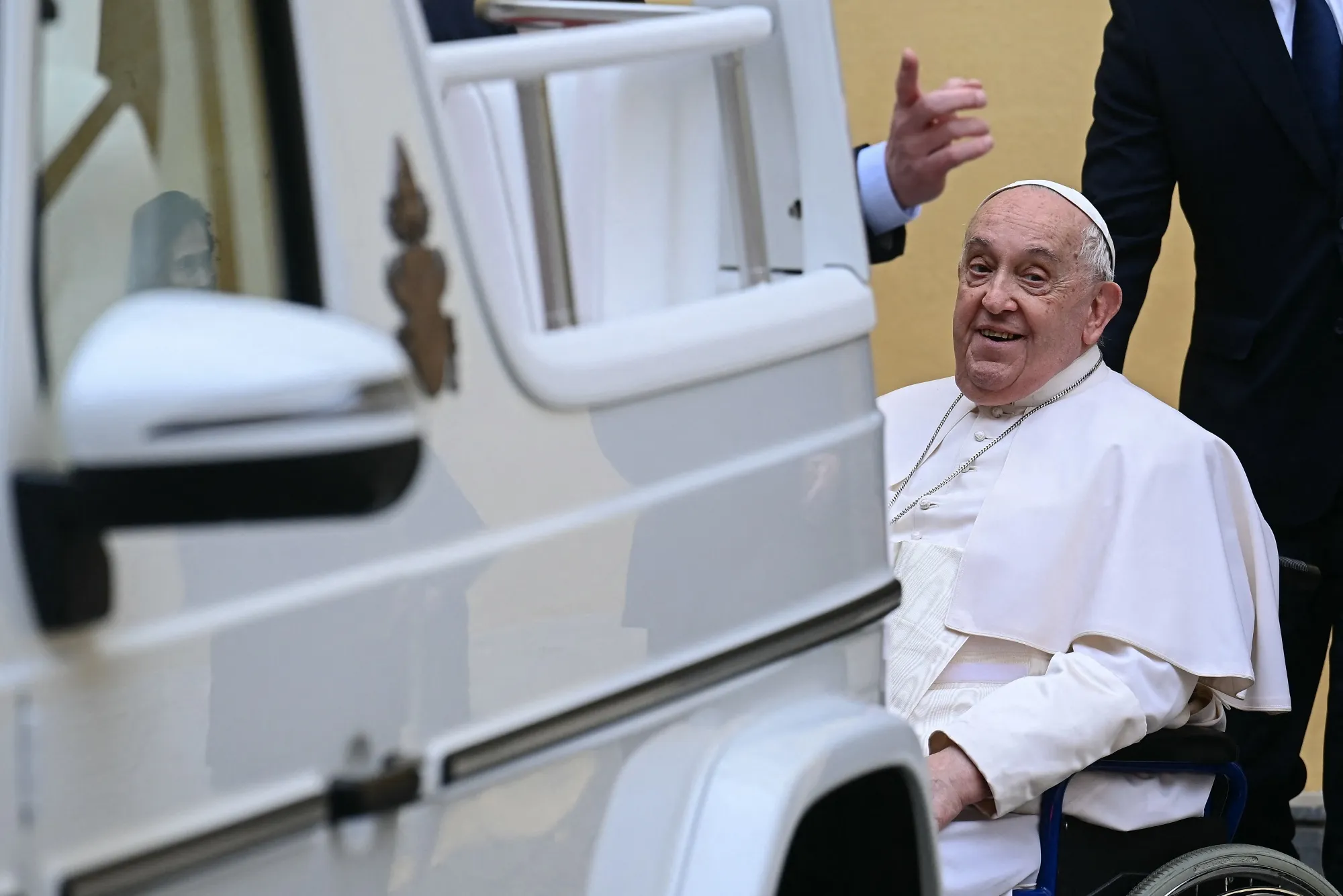 教皇方济各在2024年12月4日于梵蒂冈被介绍一辆全电动教皇专车时的反应。