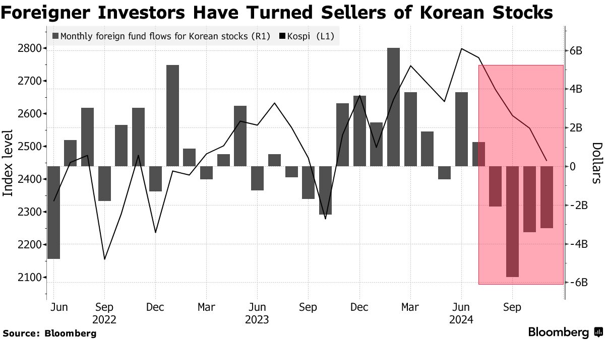 在最近的政治动荡之前,投资者已经对韩国持谨慎态度,指出该国经济放缓以及对特朗普关税的担忧。这导致连续四个月的股票流出,总额超过140亿美元,促使花旗集团、高盛集团和摩根大通上个月下调了该国股票的评级。