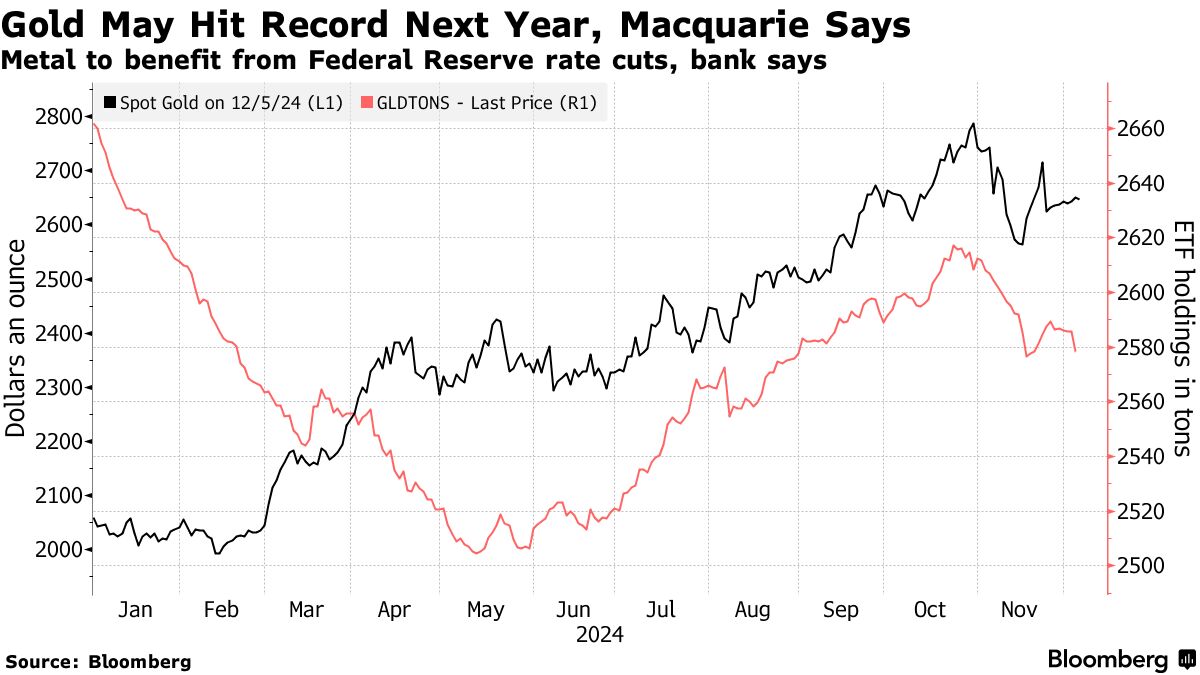 根据麦格理集团有限公司,黄金在明年有望进一步上涨,可能创下新纪录,因为美联储降息,中央银行增加黄金储备。