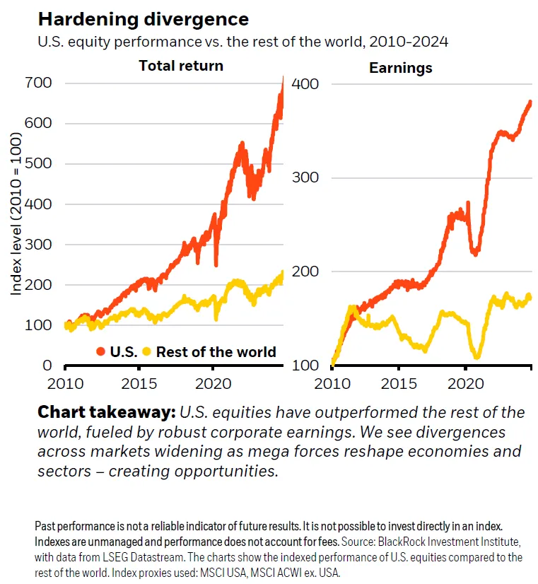 DataTrek研究在过去十年中,从价格来看,MSCI欧洲的表现平均落后于标准普尔500指数7.7%的年复合增长率,而MSCI新兴市场则落后9.6%。这是一种糟糕的表现。我们为什么会期待美国的势头继续,而不是回归均值呢?首先,美国企业在创造利润方面具有远超其他国家的能力。此图来自黑石投资研究所对2025年的展望: