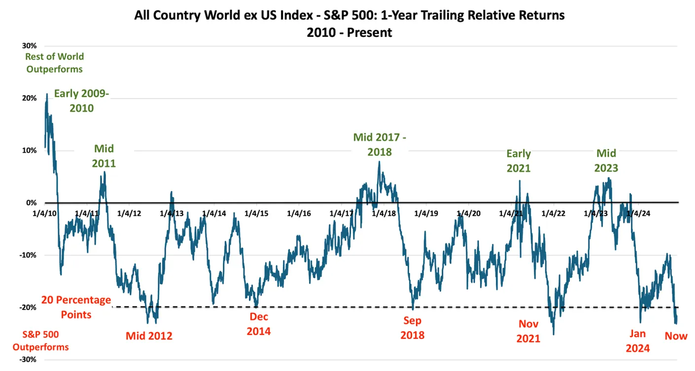 在投资世界中,有三种强大的力量是你永远不想与之对抗的:动量、均值回归和美国例外主义。然而,进入2025年,至少有一种力量将不得不让步。随着发布年度展望的季节继续,越来越清楚的是,大多数人认为这次不会回归均值,而美国主导地位背后的强劲动量可以持续下去。很难不同意。但仍然值得记录是什么最终可能使美国的超额表现回归其平均水平。