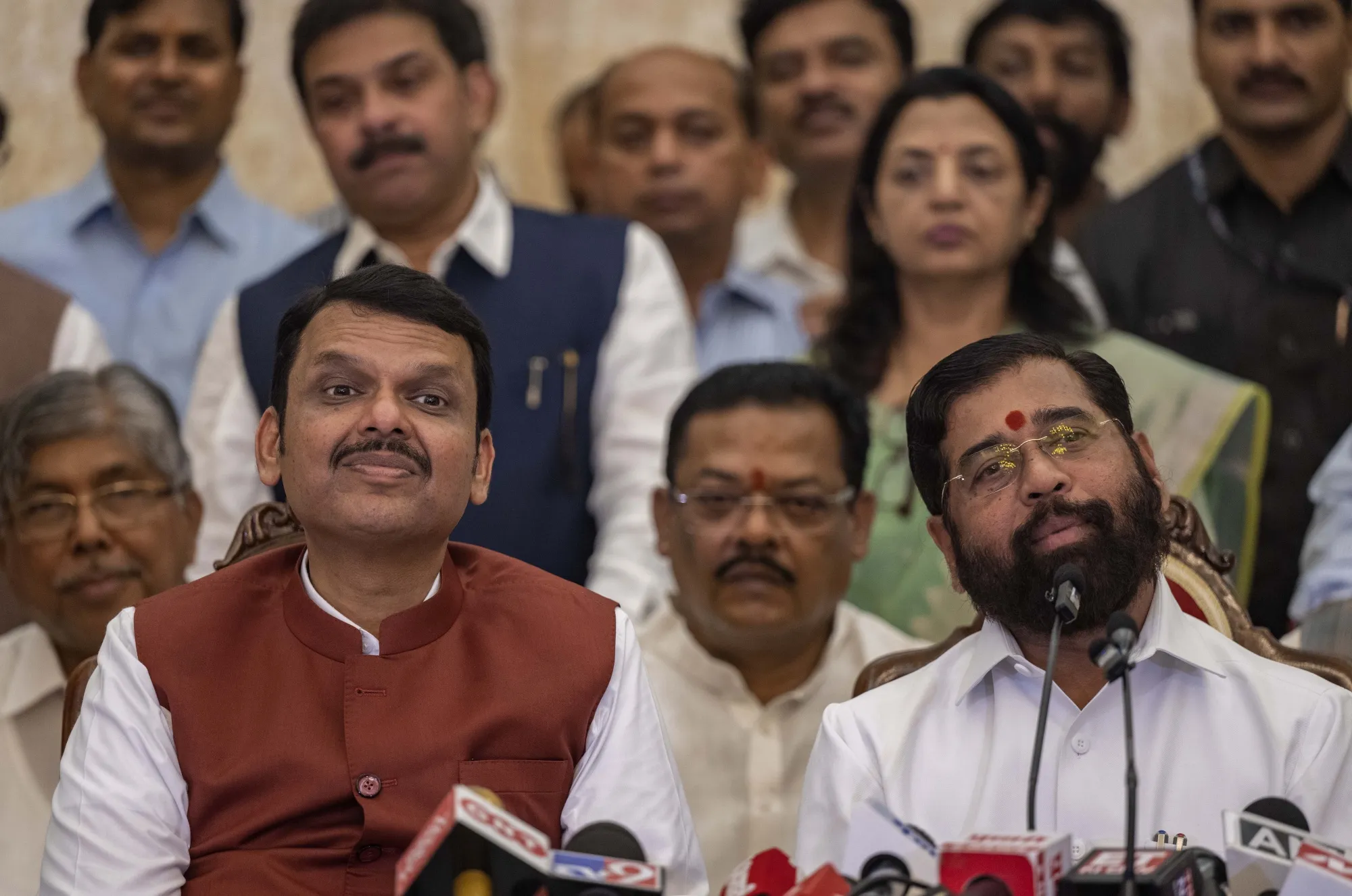 德文德拉·法德纳维斯,左,与埃克纳特·辛德在孟买于12月4日。摄影师:萨蒂什·巴特/印度斯坦时报/盖蒂图片社总理纳伦德拉·莫迪的印度人民党将任命其一位高级领导人来领导马哈拉施特拉州的政府,重新夺回这个拥有印度金融中心孟买的州的控制权。