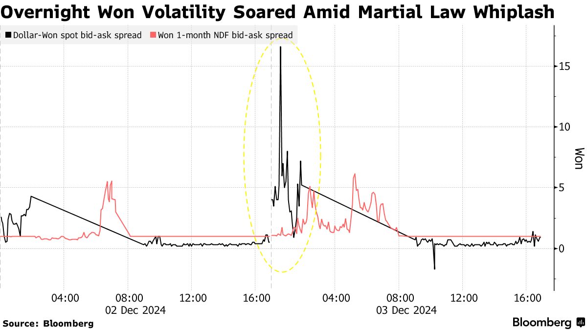 当韩国总统尹锡悦在周二晚上震惊全国,短暂地 实施 戒严令时,现货市场的买卖价差扩大至多达16韩元,并在整个夜间保持高位,彭博社汇编的数据表明。相比之下,非交割远期市场的价差约为2.5韩元,这是另一个对韩国货币进行投机的场所。