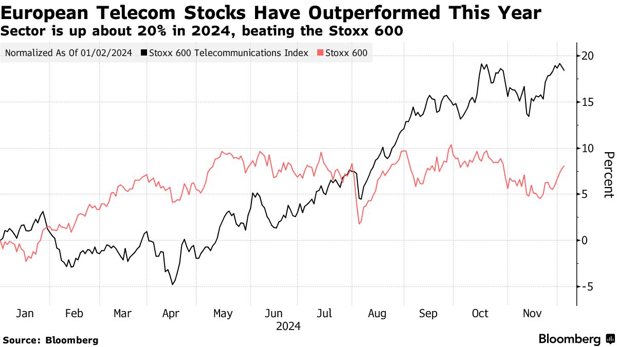 对监管变化的乐观情绪帮助该行业的股票在2024年表现优于大盘。斯托克600电信指数上涨了20%,沃达丰正朝着七年来首次全年上涨的方向前进。