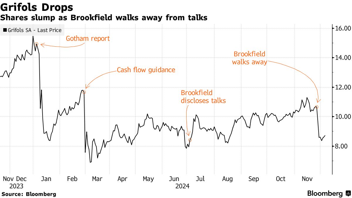 在交易破裂的消息传出后,Grifols 的股价大幅下跌,投资者的关注转向公司的债务,关于现金生成和治理不善的担忧重新浮现。