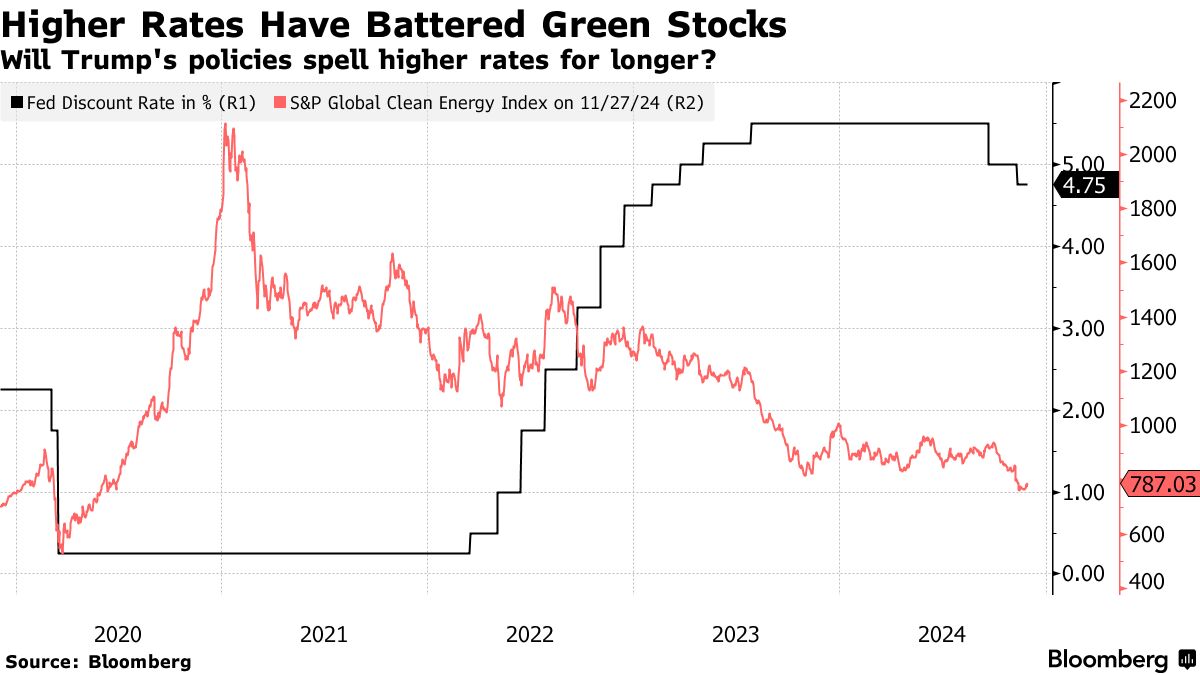 特朗普承诺减税并征收关税,作为一项政策方案的一部分,经济学家从拉里·萨默斯到约瑟夫·斯蒂格利茨都 警告 这将是 通货膨胀的。更高的通货膨胀意味着更长时间的更高利率,这对资本密集型绿色行业构成了特别威胁。