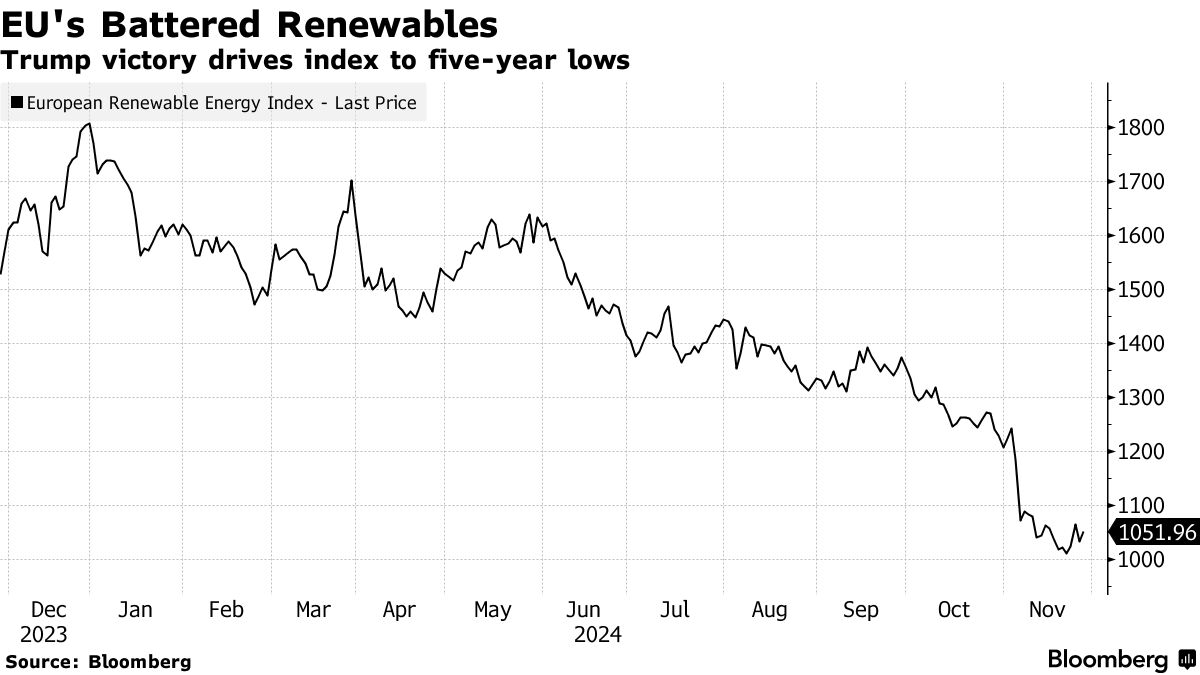 如果实施,这些政策将对美国清洁技术项目的发展造成打击,因为这将使从电池到用于建造太阳能农场的钢铁等所有产品的成本增加数十亿美元,根据一项分析,该分析由 麻省理工学院技术评论提供。加上特朗普承诺缩减绿色激励措施,如税收抵免,清洁能源股票已经出现了大幅抛售。标准普尔全球清洁能源指数自11月5日选举以来进一步下滑,现在接近4年半的低点。欧洲可再生能源指数接近六年低点。