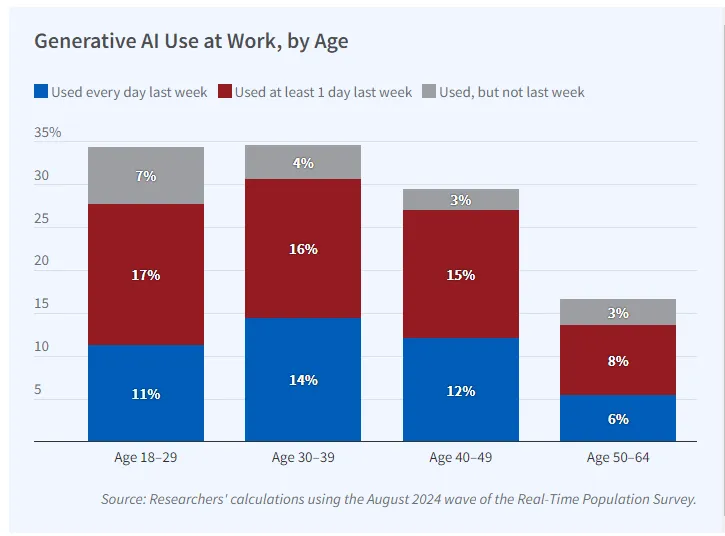https://www.nber.org/digest毫不奇怪,年轻一代使用生成性人工智能的频率远高于老一代。与个人电脑一样,用户往往受教育程度更高,收入更高。研究人员发现,男性在工作和家庭中使用生成性人工智能的可能性也高于女性。