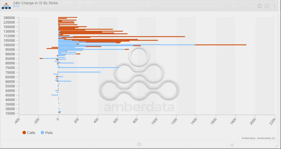 对看跌期权的需求有所上升,看跌期权是给予买方在设定的时间段内以预定价格出售资产的权利的合约。根据跟踪数字资产市场数据的Amberdata,行使价格为95,000美元和100,000美元的看跌期权在过去24小时内的未平仓合约头寸最大。75,000美元和70,000美元范围内的看跌期权需求也有所增加。
