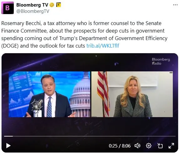 今天在彭博电视台的权力平衡早间版中,主持人乔·马修采访了前参议院财政委员会顾问、税务律师罗丝玛丽·贝基,讨论特朗普政府效率部即将进行的深度削减政府开支的前景以及税法变更的展望。