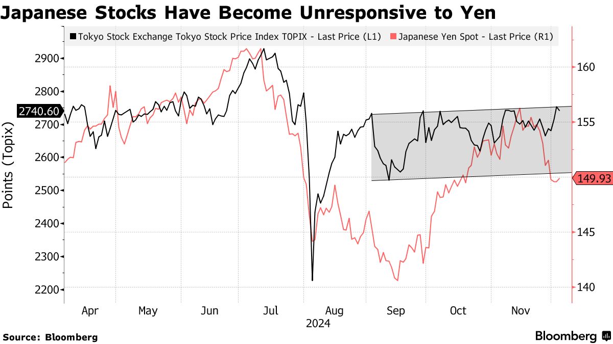 自从夏季大跌以来,东证指数一直停留在一个狭窄的交易区间,即使日元在9月中旬达到每美元139.58的14个月高点和11月中旬的156.75低点之间波动,而后者距离7月的38年低点并不远。