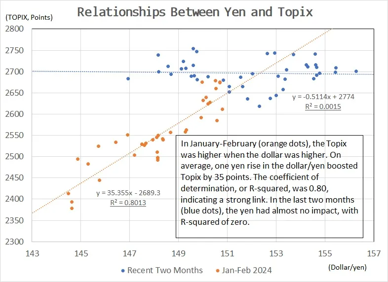 在过去两个月中,东证指数和日元基本上是独立移动的,两者之间的决定系数——衡量两个独立数据之间联系的指标——几乎为零。这远低于通常被认为表明某种关系的0.50水平。