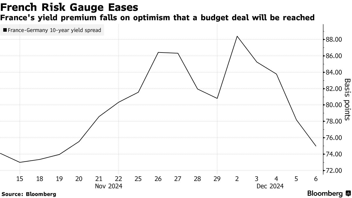 玛丽娜·勒庞在12月5日。摄影师:西里尔·马尔西拉西/彭博社法国政府债券连续第四天上涨,推动该国债券的风险溢价降至两周多以来的最低水平,市场普遍预计该国分歧重重的议会最终将就预算达成协议。