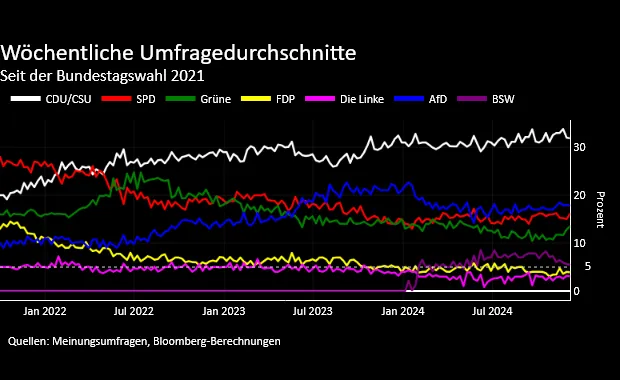 根据彭博社计算的多项当前调查的平均值,CDU/CSU以约32%的支持率领先,德国选择党(AfD)以约18%位居第二,社会民主党(SPD)以16%位居第三。