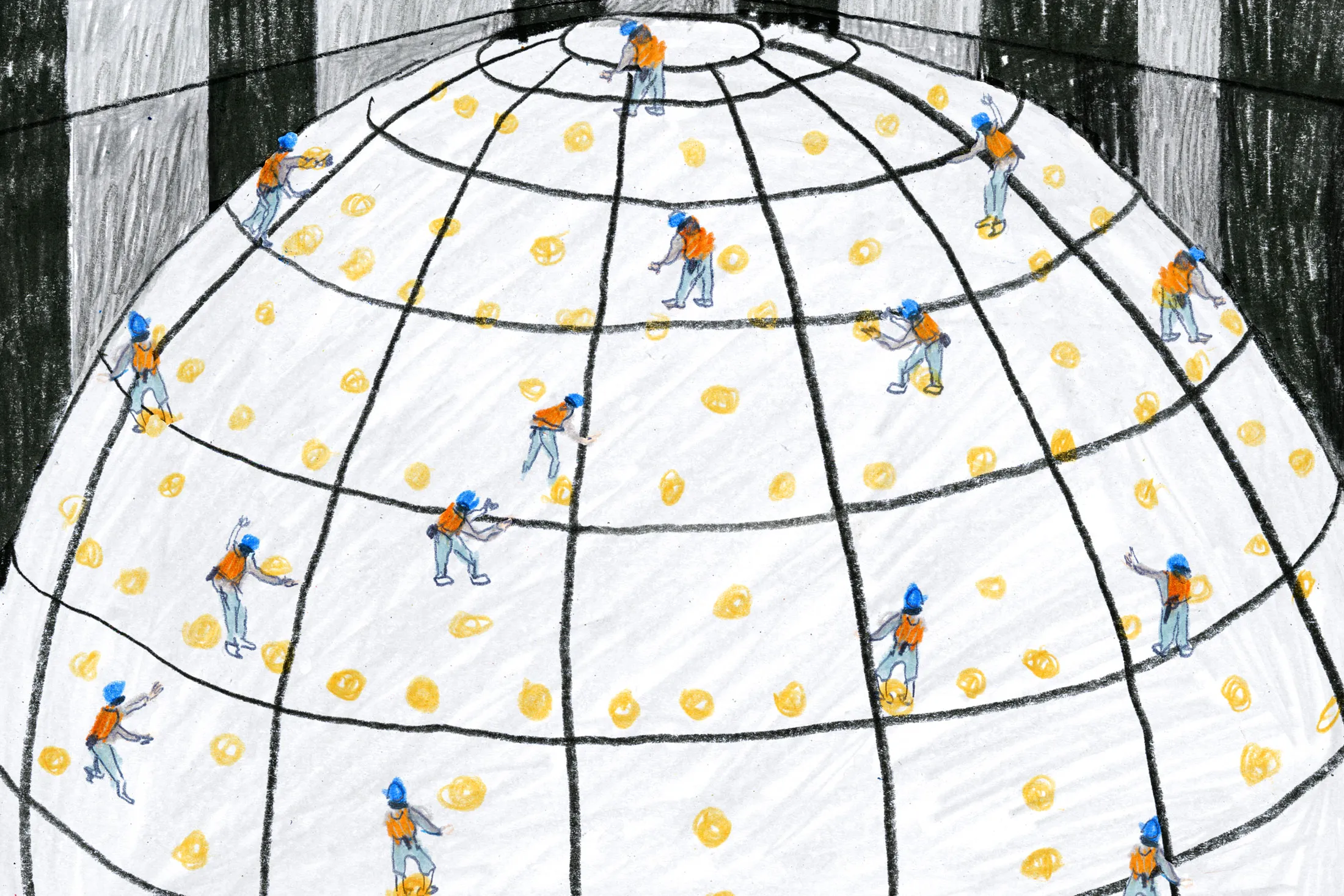 数十名工人被安全带和绳索固定,分布在这个12层高、钢板包裹的亚克力球体的表面上。他们的铆接和钻孔声在地下室回荡。