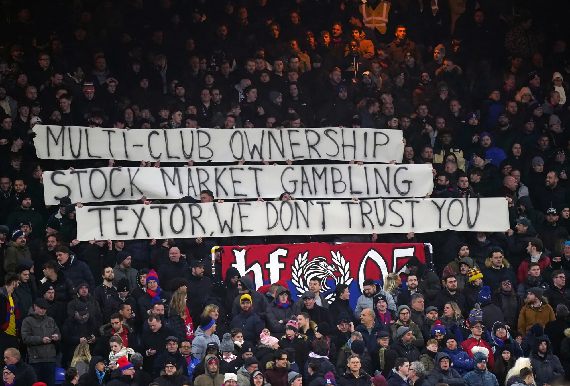 水晶宫球迷展示了一条提到水晶宫共同拥有者约翰·泰克斯特的信息。