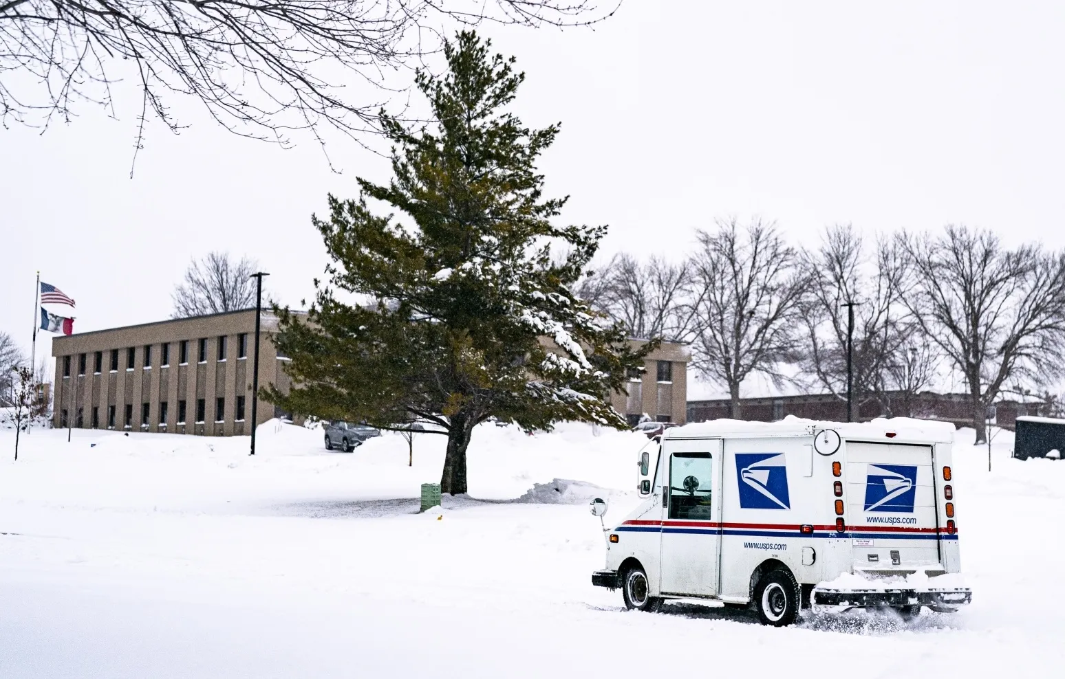 美国邮政服务的卡车在爱荷华州西德莫因斯的雪中行驶。