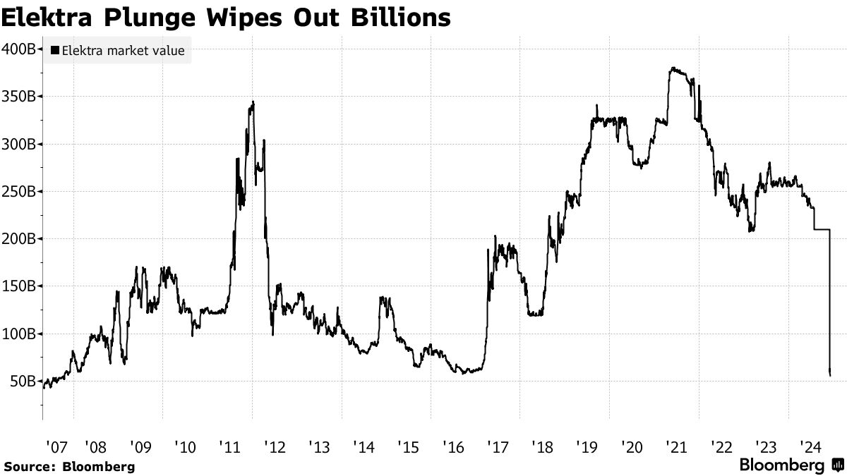 然后在周一,交易开始出现——这些交易的估值比七月时低了50%。如此低的出价通常会触发证券交易所的熔断机制,但证券监管机构CNBV下令覆盖,违抗了由Elektra控股股东、亿万富翁里卡多·萨利纳斯·普列戈的律师赢得的法院命令。