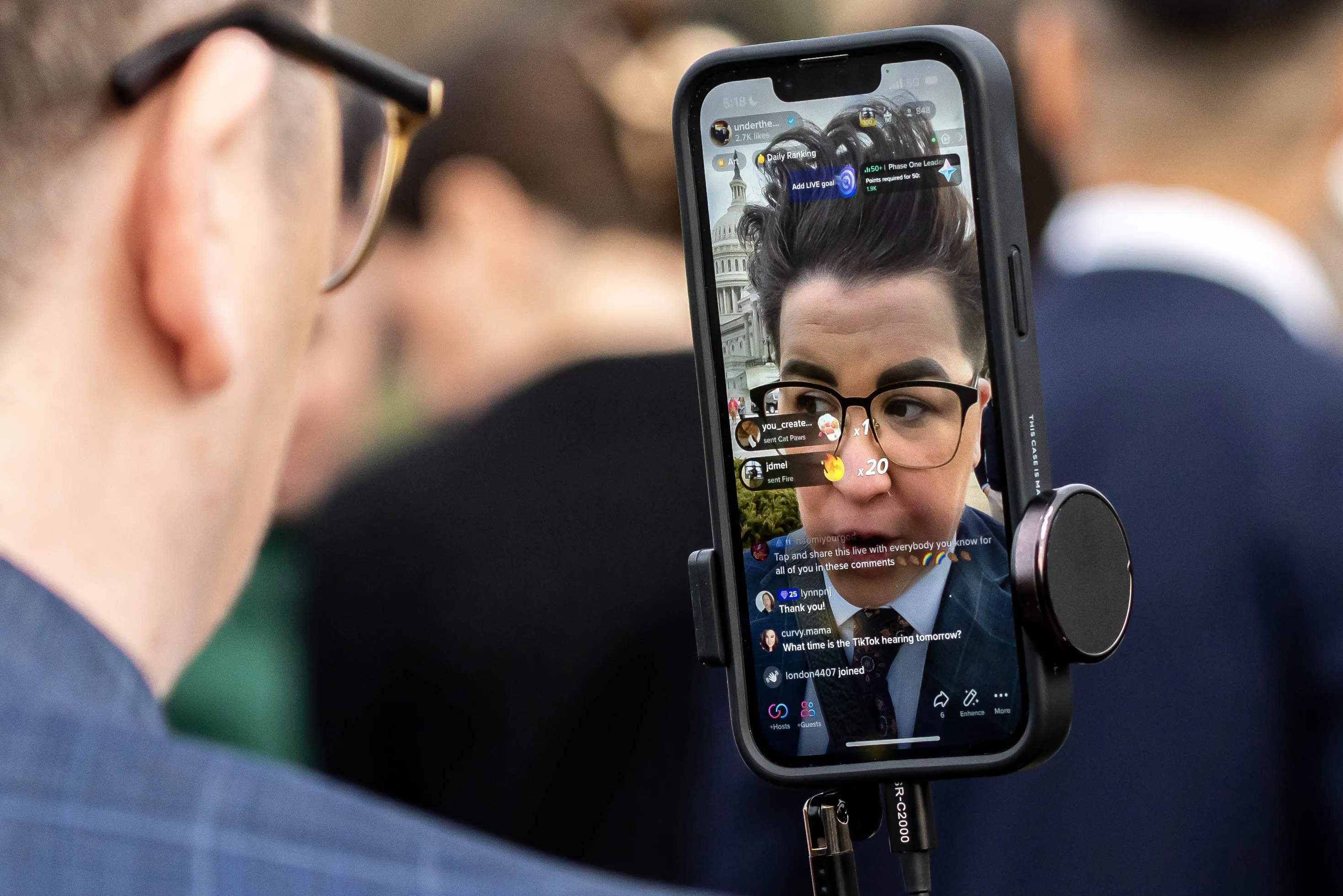 Vitus Spehar,TikTok频道《新闻桌下》的主持人在华盛顿美国国会大厦外的新闻发布会上进行直播。摄影师:Nathan Howard/Bloomberg### 谁将从TikTok的剥离中受益?