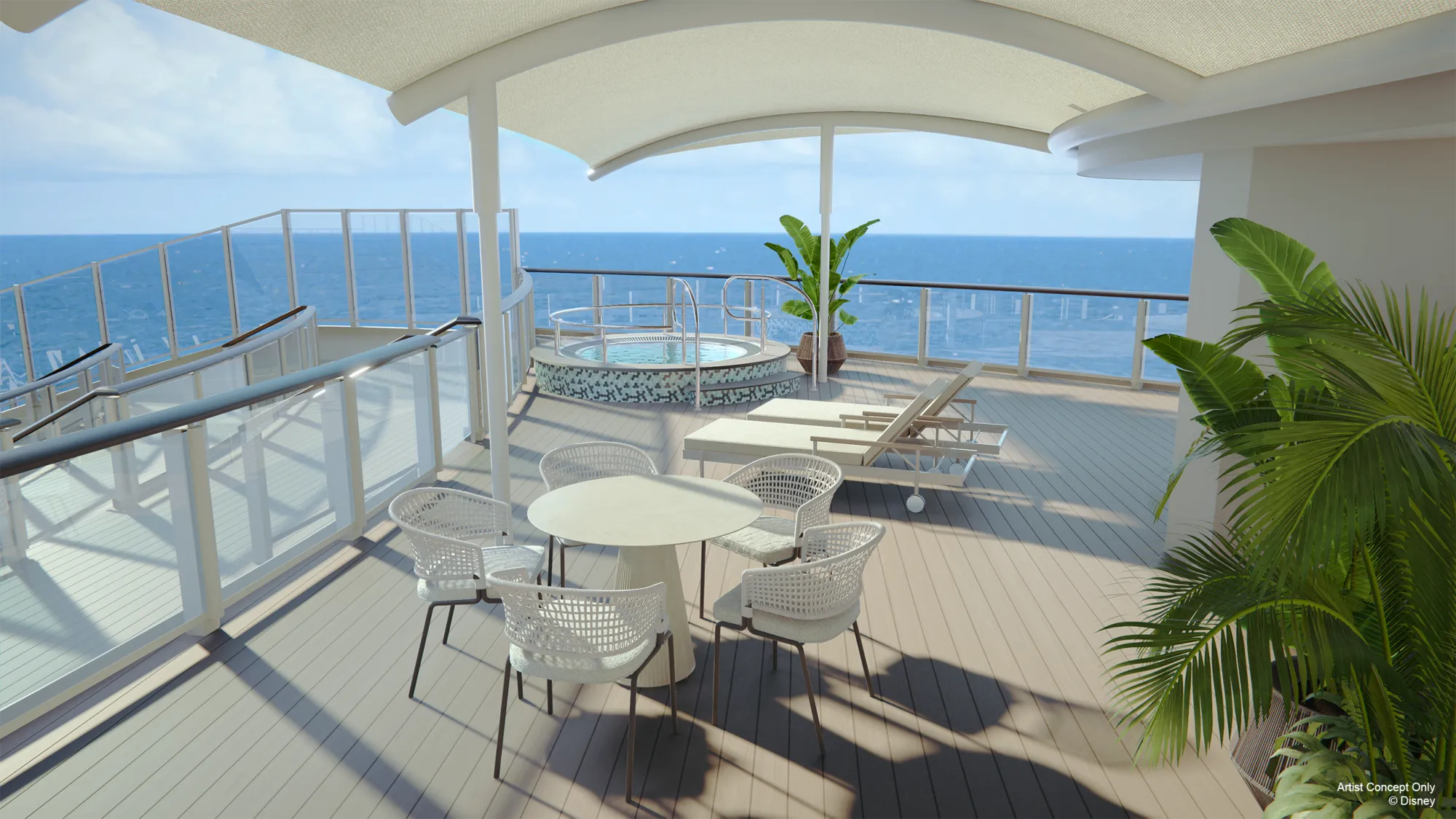 海景阳台的礼宾家庭舱。来源:迪士尼邮轮公司客人可以选择三到五晚的住宿,首航的价格从约1,564美元起,适用于两位成人,而四口之家的三晚邮轮费用约为3,400美元。对于那些希望进一步升级的人,有两个冰雪奇缘主题的套房可供选择。