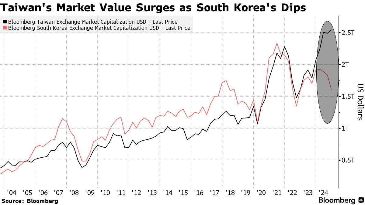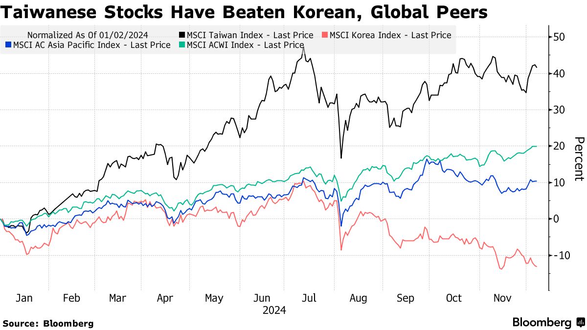 随着韩国陷入政治混乱,其股市面临进一步落后于主要科技竞争对手台湾的风险,而台湾正沐浴在全球人工智能繁荣的光辉中。