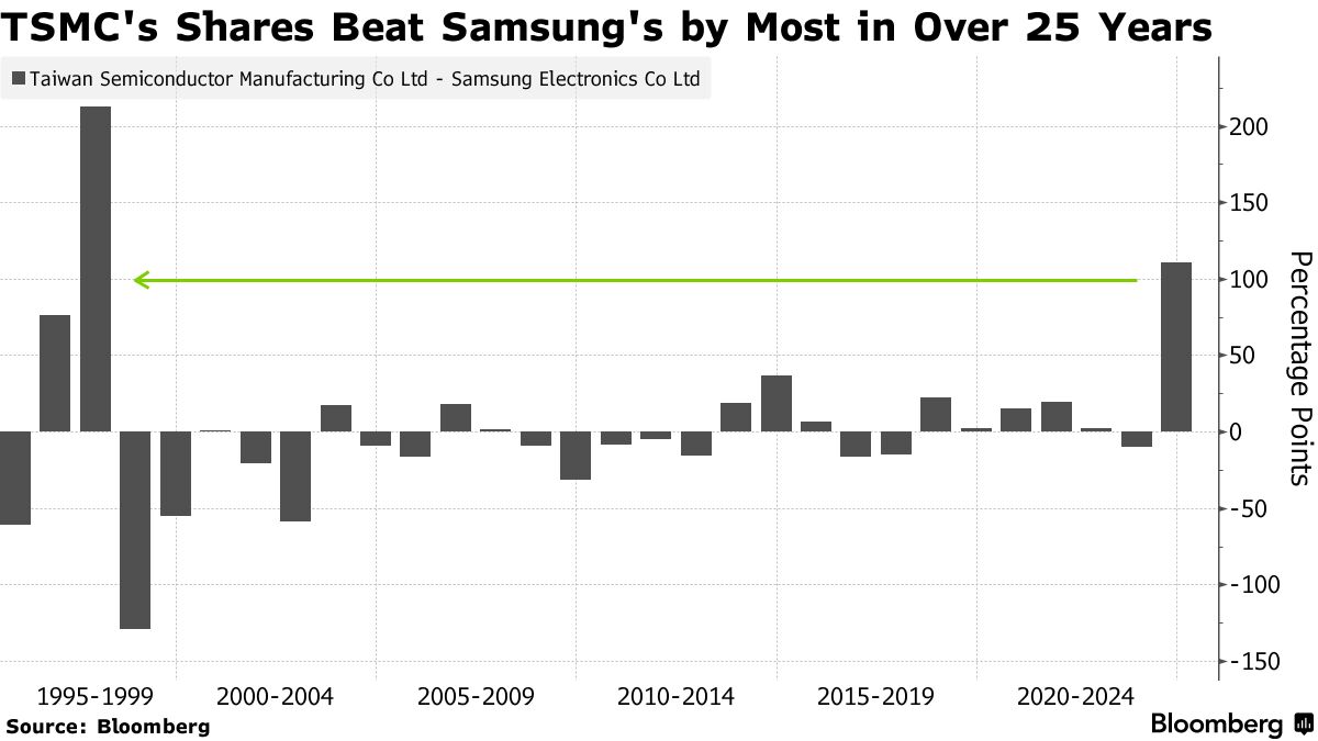 台湾股市基准今年近30%的激增,预计将是自2009年以来的最佳表现,已经帮助促成了亚洲两个科技主导市场之间的历史性分歧。该岛的市场资本化现在超过韩国约9500亿美元,因为全球的人工智能领跑者从英伟达公司到微软公司再到OpenAI都越来越多地转向台湾公司寻求供应。