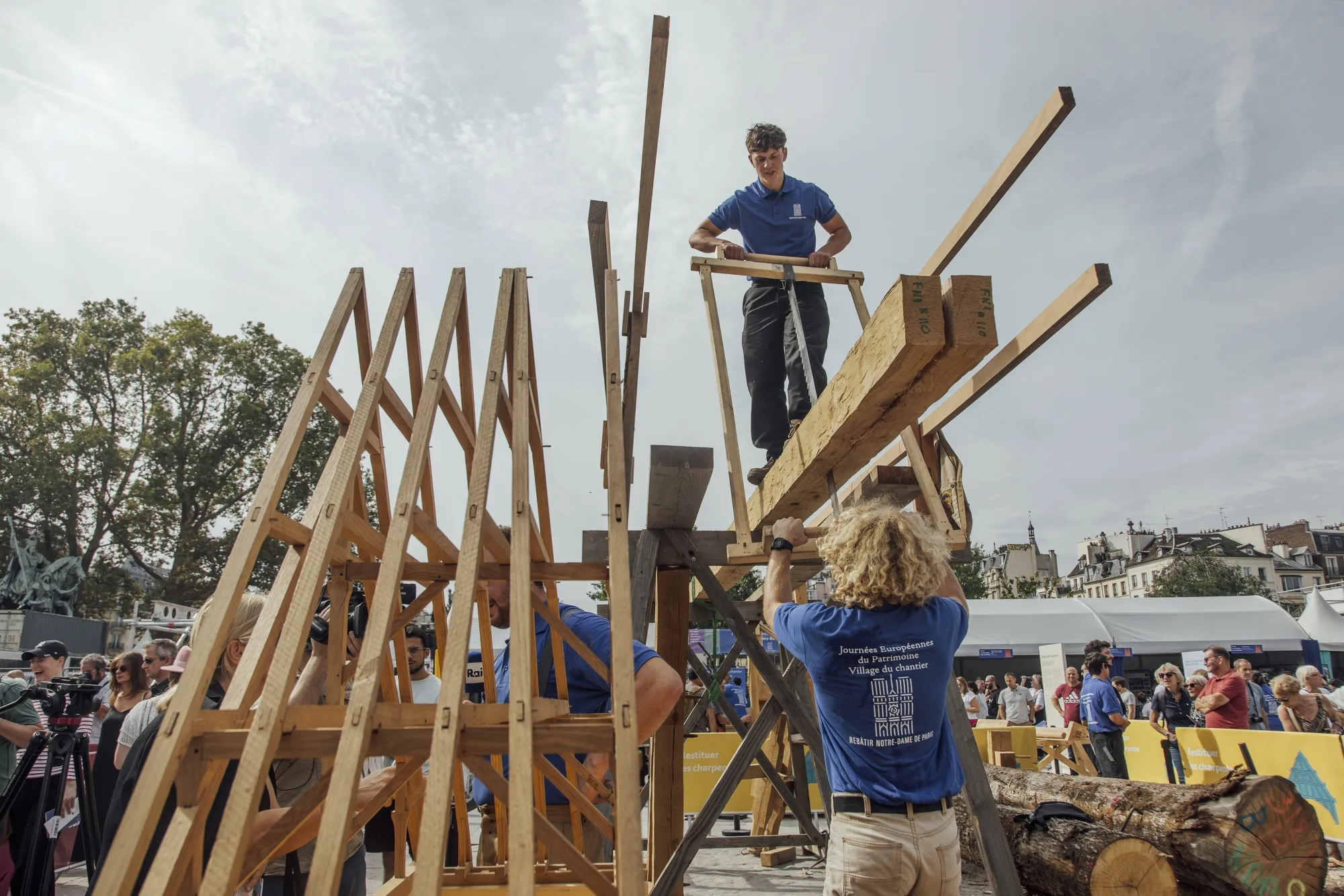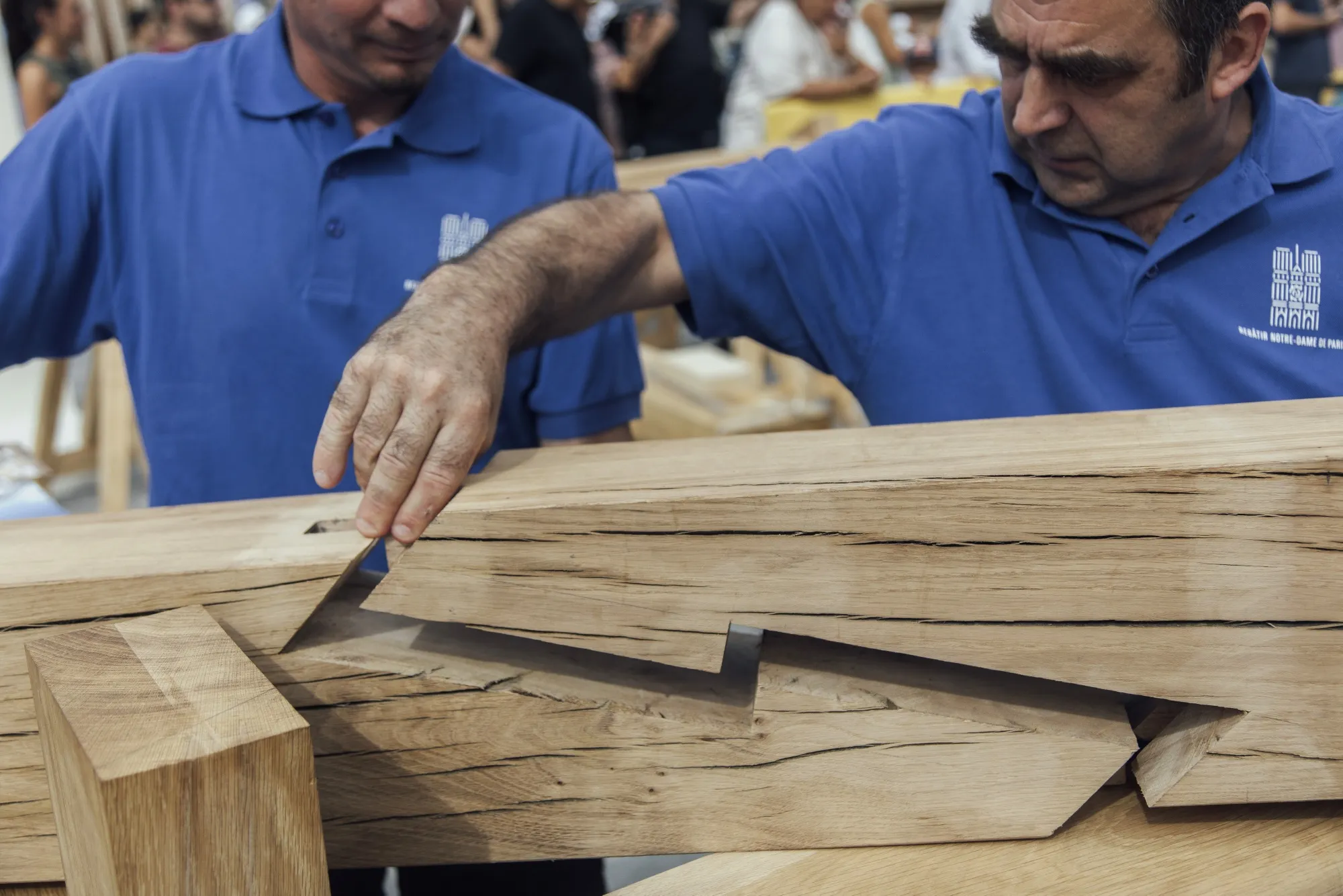 木匠在2023年的演示中展示了一种中世纪的梁接头。摄影师:Cyril Marcilhacy/Bloomberg