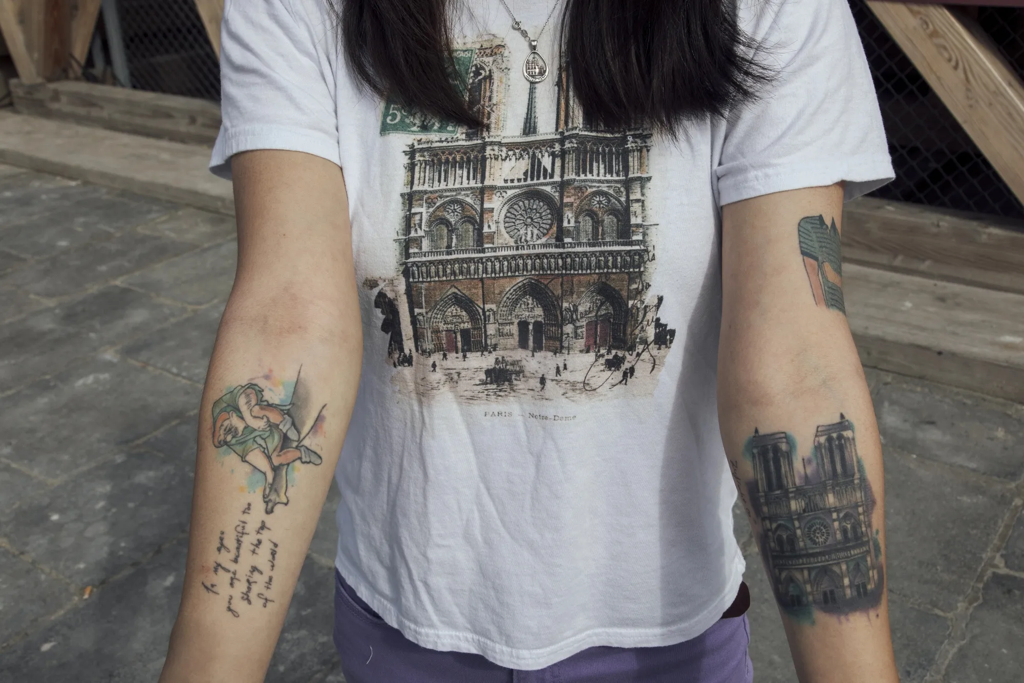 2023年9月16日,在巴黎圣母院的建筑村举行的欧洲遗产日活动中,一位身上有巴黎圣母院纹身的游客。摄影师:Cyril Marcilhacy/Bloomberg当巴黎圣母院的屋顶和尖塔在2019年4月的火灾中倒塌时,可能会有人想用现代方法而不是原来的橡木梁来重建它们。毕竟,这些在大约800年后被摧毁的屋顶梁一直隐藏在教堂的石灰岩拱顶之上,而法国建筑师已经有效且美丽地使用混凝土重建了法国加冕教堂兰斯大教堂的炸弹损坏屋顶。