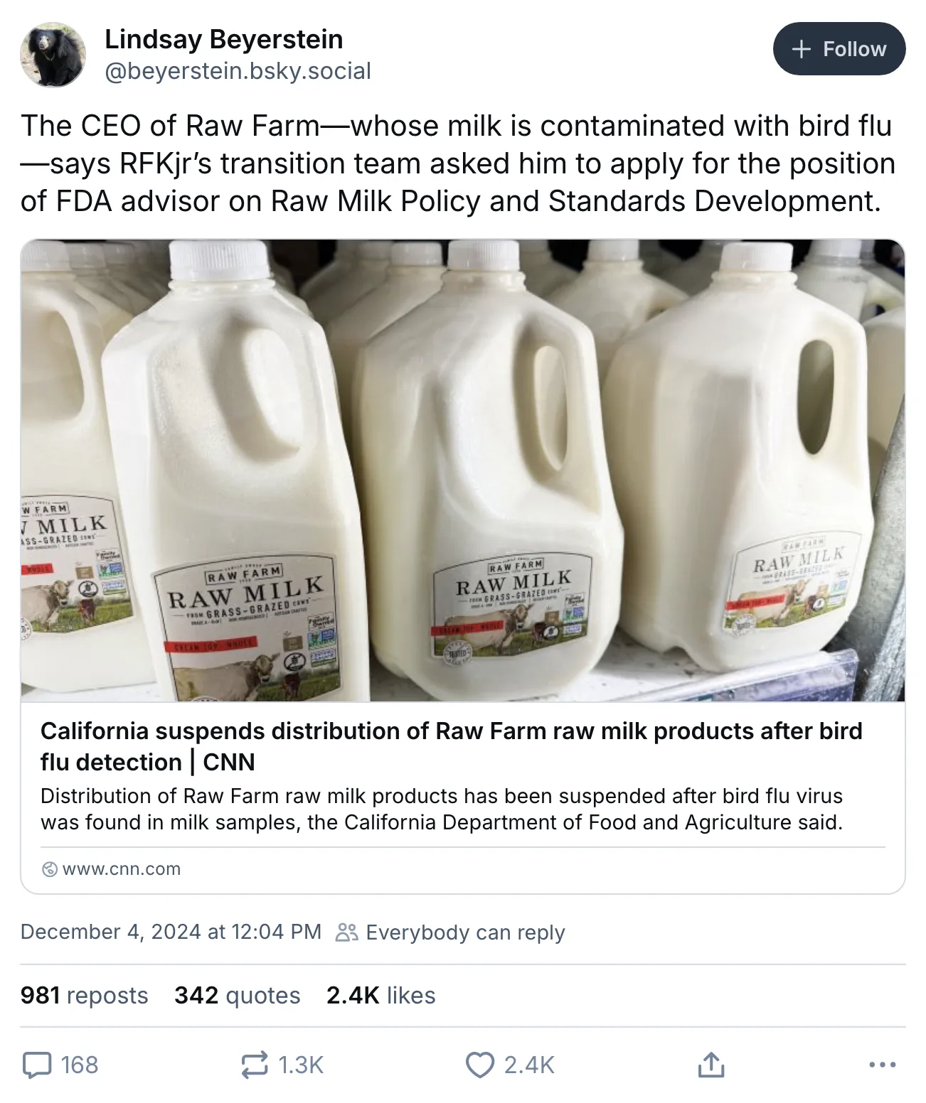 显然,RFK Jr. 是一种跨大西洋的流行病。“当新闻报道一个旨在解决乳制品行业甲烷排放的项目时,随之而来的是一波错误信息和抵制黄油的呼声,这或许不应该让人感到惊讶,”写道 拉拉·威廉姆斯,我们在英国的环保大师。我们生活在一个即将成为 美国卫生负责人 的人“认为氟化物——一种被认为能保护数百万儿童免受牙齿危害的矿物——是一种神经毒素,并表示 生牛奶——可能含有包括H5N1在内的病原体,也就是 禽流感——被不公正地剥夺了美国人的权利。然而,在经过多年的研究、安全试验和在牛群中的使用后,消毒牛打嗝的计划引发了社交媒体驱动的反弹,让参与者感到措手不及。”