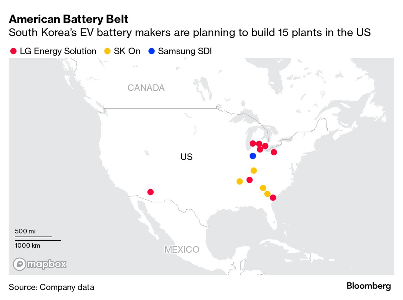 韩国三大电池制造商——三星SDI、LG能源解决方案和SK On公司——已在美国宣布了15个电池厂,这是全球三大电池中心——中国、日本和韩国中最积极的投资行动。