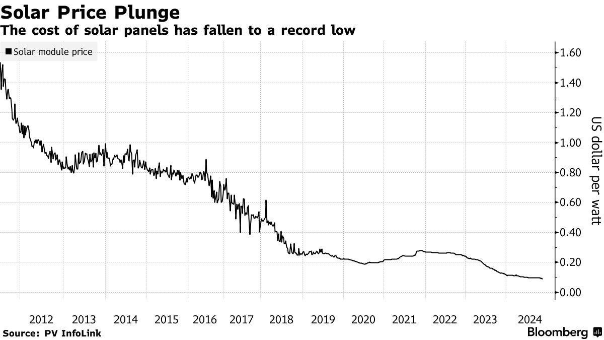 该行业困境的根源是自2021年开始的工厂扩建,导致了巨大的产能过剩,尤其是在中国,全球超过80%的制造业发生在这里。目前有足够的产能每年生产超过1100吉瓦的面板。这不仅几乎是预计到2024年全球安装量的两倍,而且根据BloombergNEF的预测,直到2035年都不需要这么多。