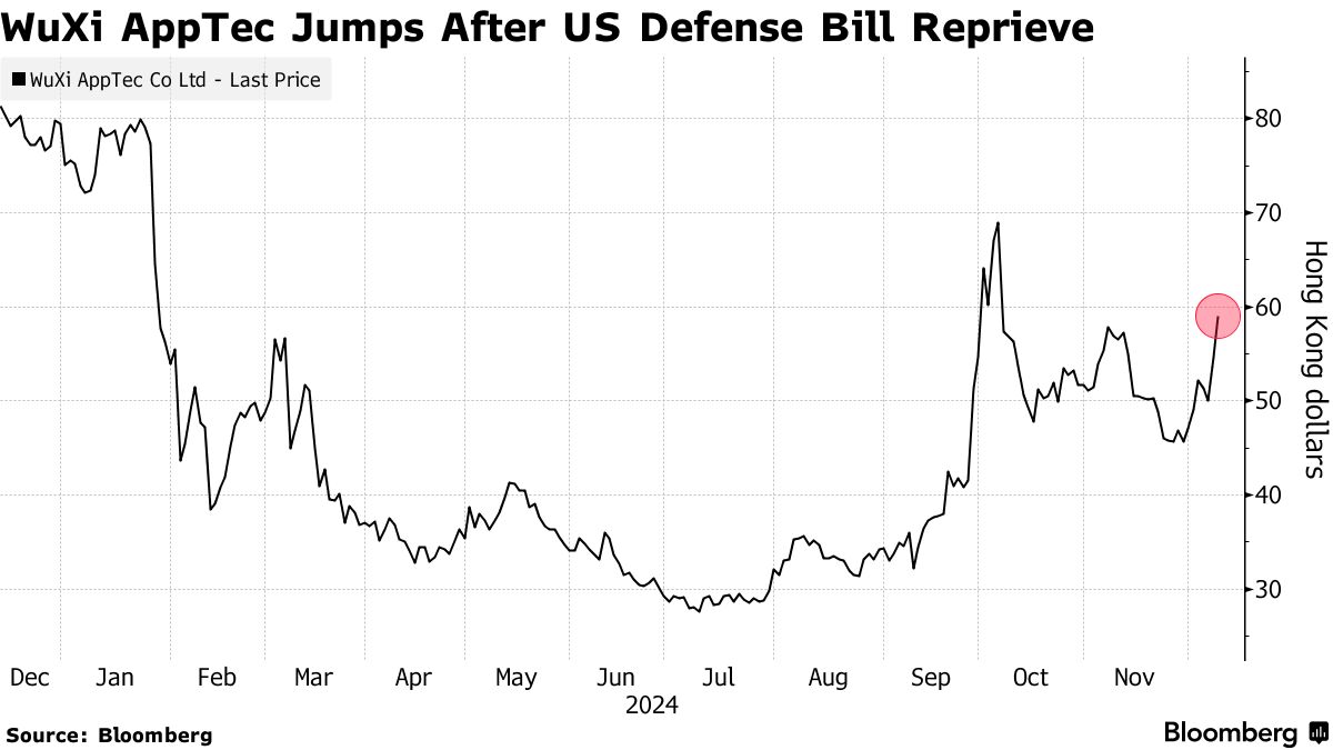 股份 无锡药明康德股份有限公司 和 无锡生物科技开曼公司 周一大幅上涨,此前一项针对中国生物技术服务公司的美国立法草案被排除在一项关键的国防法案之外。