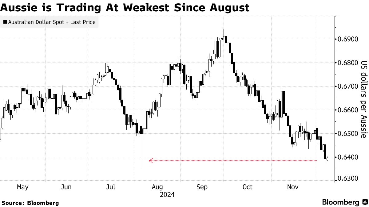 自特朗普赢得美国大选以来,澳元已下跌近4%——成为十国集团中表现最差的货币——因为在美联储降息预期减弱的情况下,美元大幅上涨。美国经济的韧性和对避险资产的需求也帮助提升了美元,资产管理者将看跌押注削减至七年来的最低水平。
