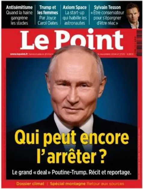 弗拉基米尔·普京在西方的声誉从未如此强大。他被视为某种邪恶的操控者,轻松掌控着世界其他地方,刚刚在美国特朗普的回归中赢得了一场巨大的胜利。这种看法可能有些过头。金融洞察公司的彼得·阿特沃特将杂志封面作为反向指标。当一本杂志向世界展示一个重大趋势时,通常意味着这个趋势已经变得不可忽视,并且已经走到了尽头。他提供了上个月法国杂志《观点》的封面。标题可以翻译为:“谁还能阻止他?”: