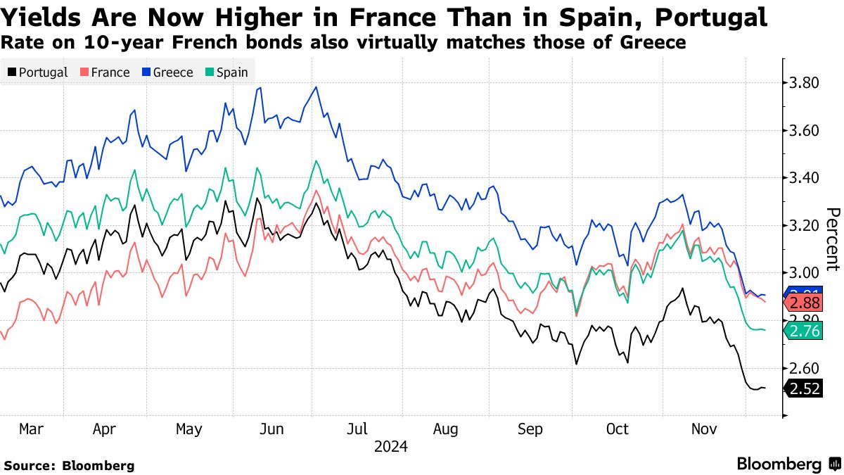 即使在最近几次会议上缩小了差距,法国的借贷成本仍高于曾经处于该地区债务危机中心的国家。10年期收益率高于评级较低的西班牙和葡萄牙,并且大致匹配希腊的收益率,颠覆了欧洲债券市场的传统层级。