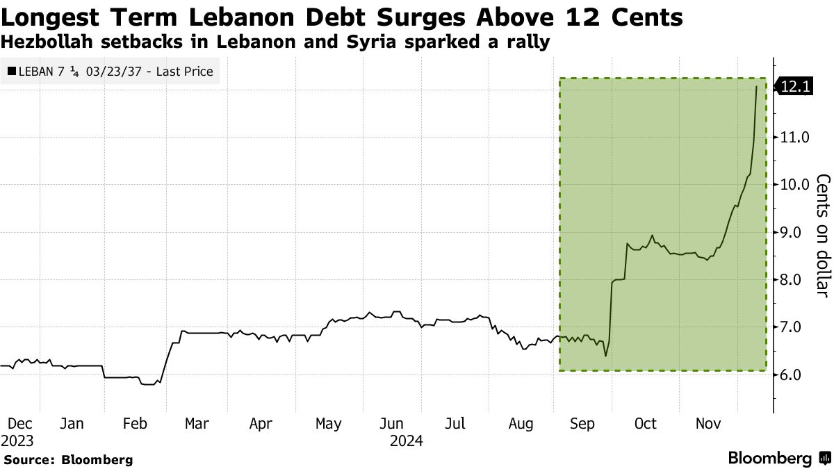 阿萨德在叙利亚的倒台激发了投资者对黎巴嫩证券的兴趣,周一再次引发热潮。九只到期时间从2026年到2037年的美元债券交易价格超过12美分,而大部分时间的平均价格约为6.5美分。这使它们成为新兴市场中表现最好的债券,尽管这些证券仍处于违约状态,重组或救助几乎没有进展。