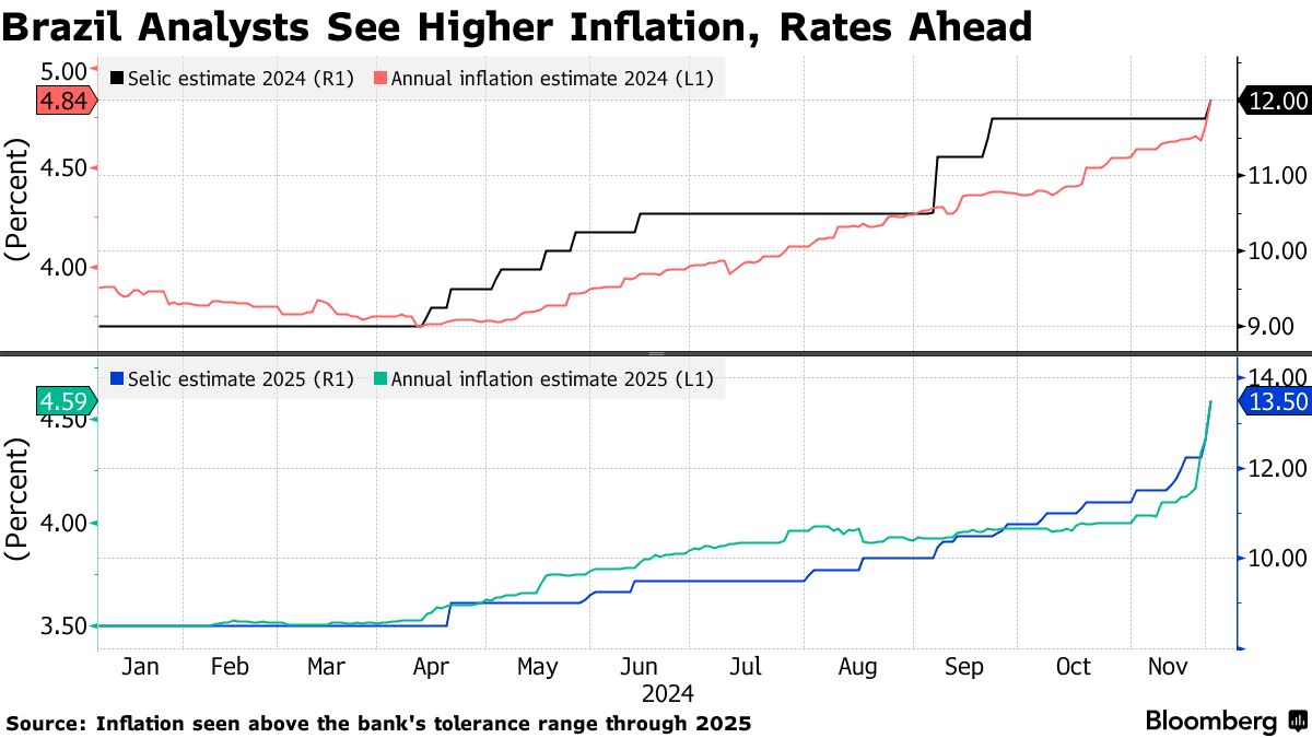巴西经济学家提高了对通货膨胀和借贷成本的预估,预计到2027年,投资者押注中央银行将在本周的会议上采取更激进的加息措施。