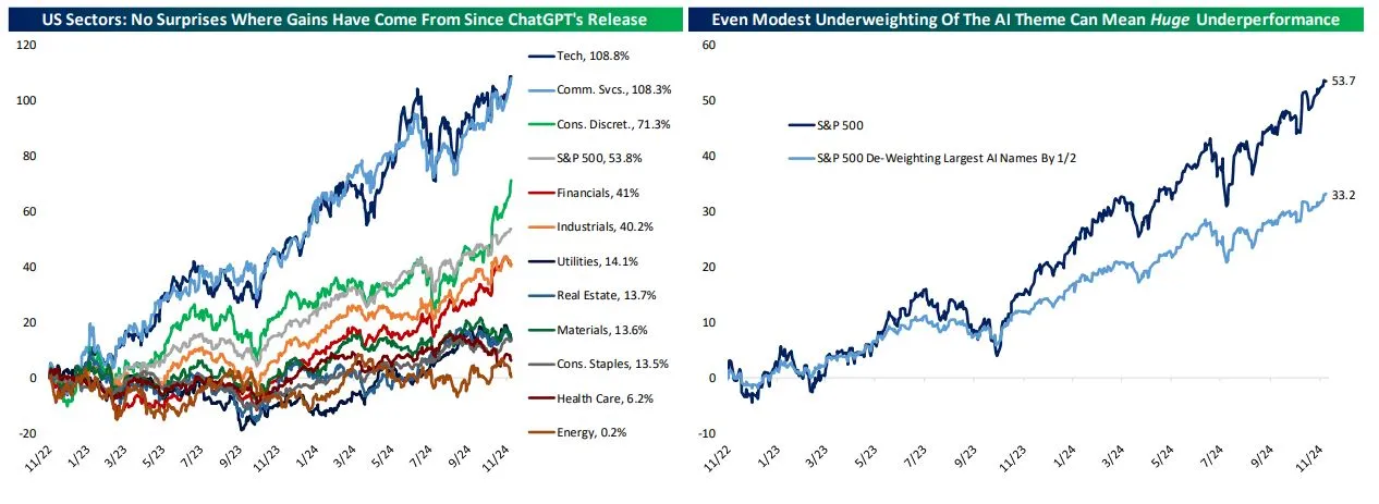 人工智能无疑是一项昂贵的事业。但金钱并不是这里的限制因素。毕竟,数万亿美元已经流入人工智能领域——Bespoke Investment Group 的一份报告显示,在过去两年中,与 AI 相关的股票(达到 13.1 万亿美元)的增长,占同期全球股票市场总市值增长的约 45%。人工智能不仅在当今市场中占据主导地位,它几乎就是市场。