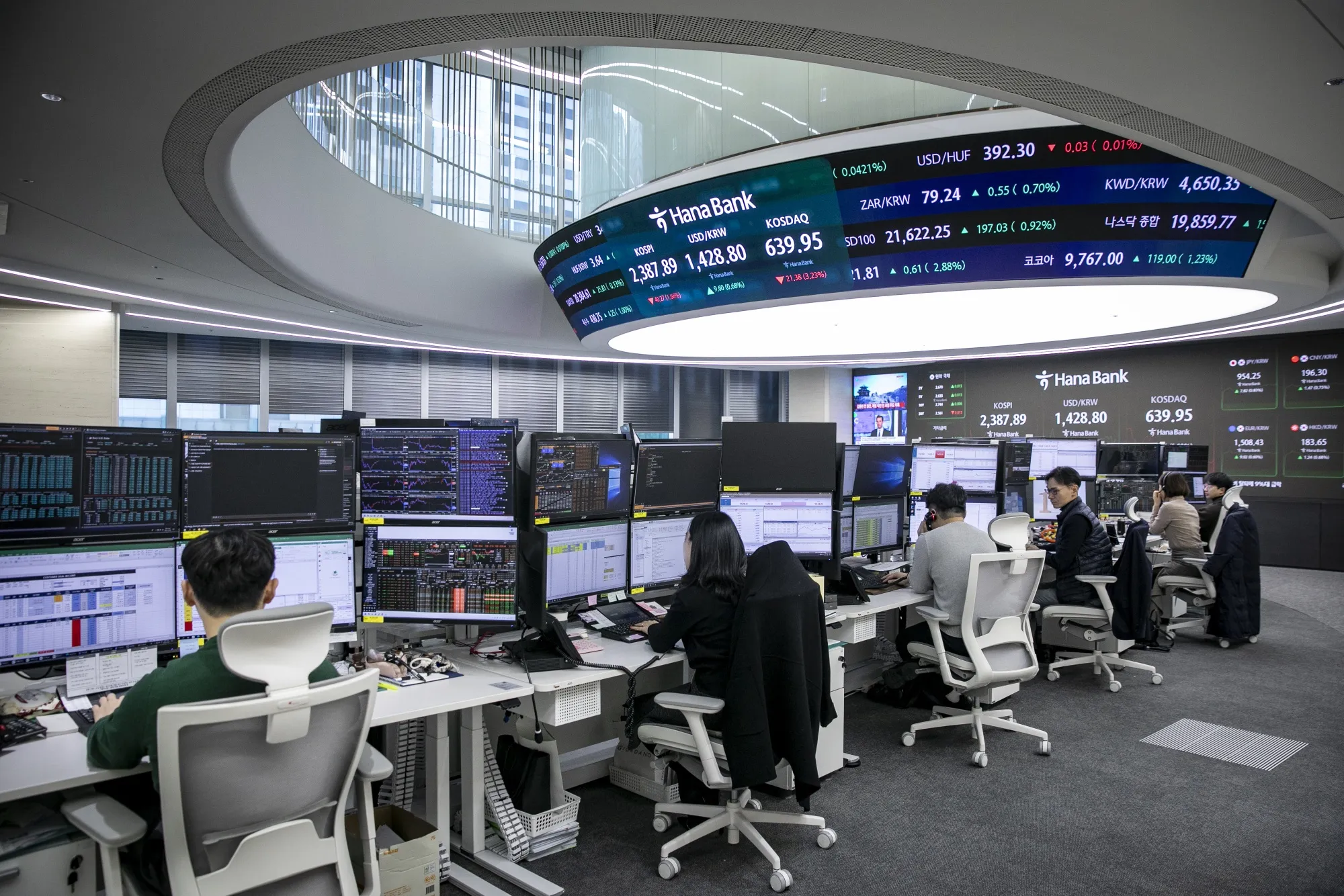 12月9日,首尔汉拿银行的交易室内显示股票数据的屏幕。摄影师:Woohae Cho/Bloomberg韩国股市在周二上涨,寻求自上周短暂的戒严法令将国家推入政治动荡以来的首次日内上涨。