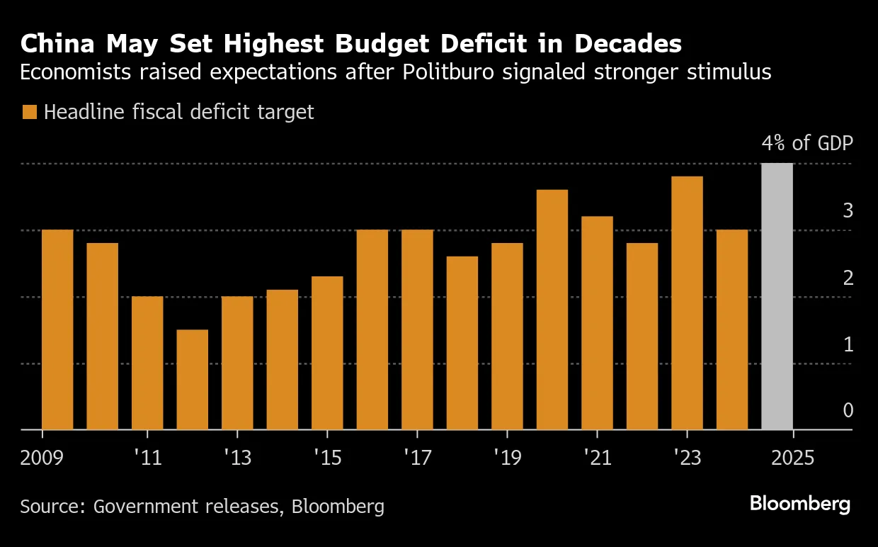 本周来自中国政策制定者的强烈信号导致了对即将到来的刺激措施的高期望。在强有力的承诺的支持下,来自共产党决策机构的承诺旨在通过“更加积极”的财政政策和转向“适度宽松”的货币政策来促进增长,经济学家表示,中国可能将预算赤字提高到三十年来的最高水平,并进行自2015年以来最深的降息。中国的股市在周二早盘因所有这些乐观情绪而上涨,但随后失去了动力。我们以前也经历过这种情况——高期望的周期后是失望或对推出的措施可能不足以振兴世界第二大经济体的谨慎。这次会有所不同吗?习近平主席似乎认为会,他在周二表示,中国对实现今年的经济增长目标充满信心。