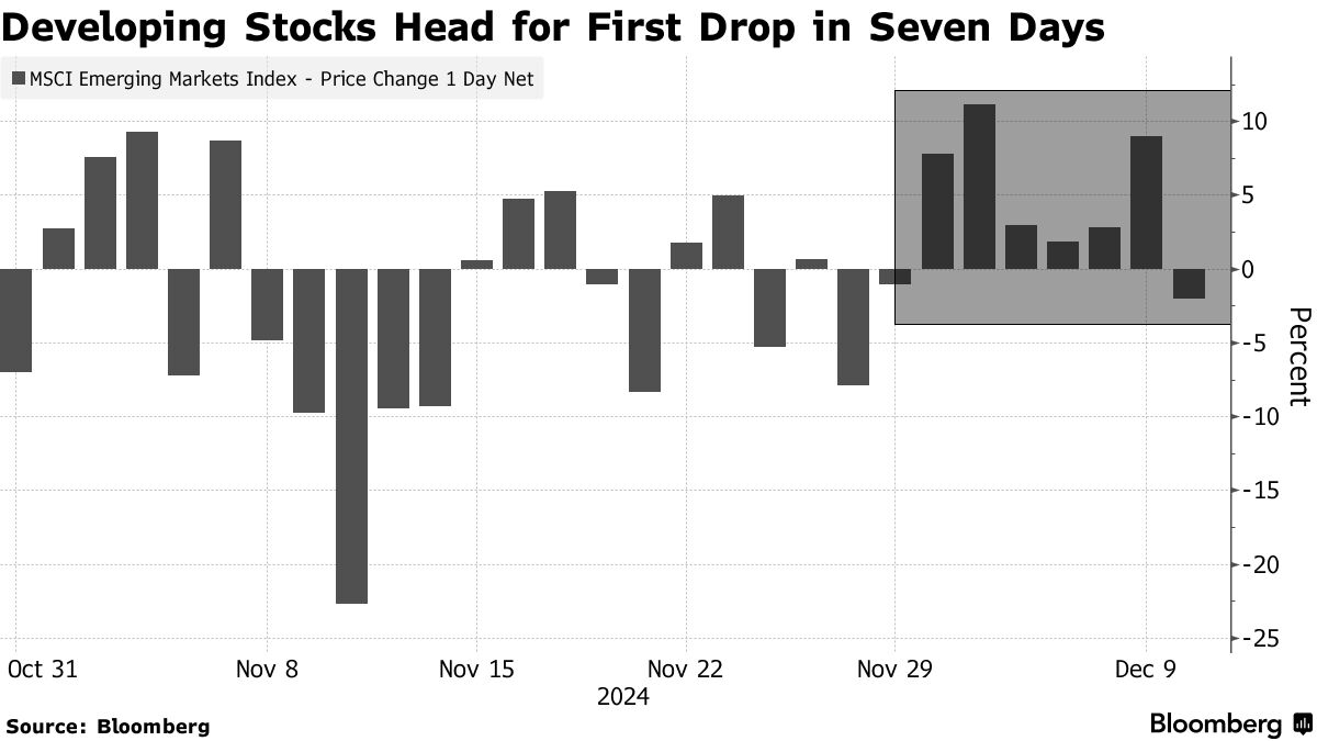 MSCI新兴市场股票指数下跌0.2%,受到台湾半导体制造公司有限公司的拖累。尽管中国的最高领导人表示明年将采取更大胆的经济支持措施,并承诺实施“适度宽松”的货币政策,但根据布朗兄弟哈里曼的策略师埃利亚斯·哈达德的说法,最新的贸易数据再次指向疲弱的国内需求。