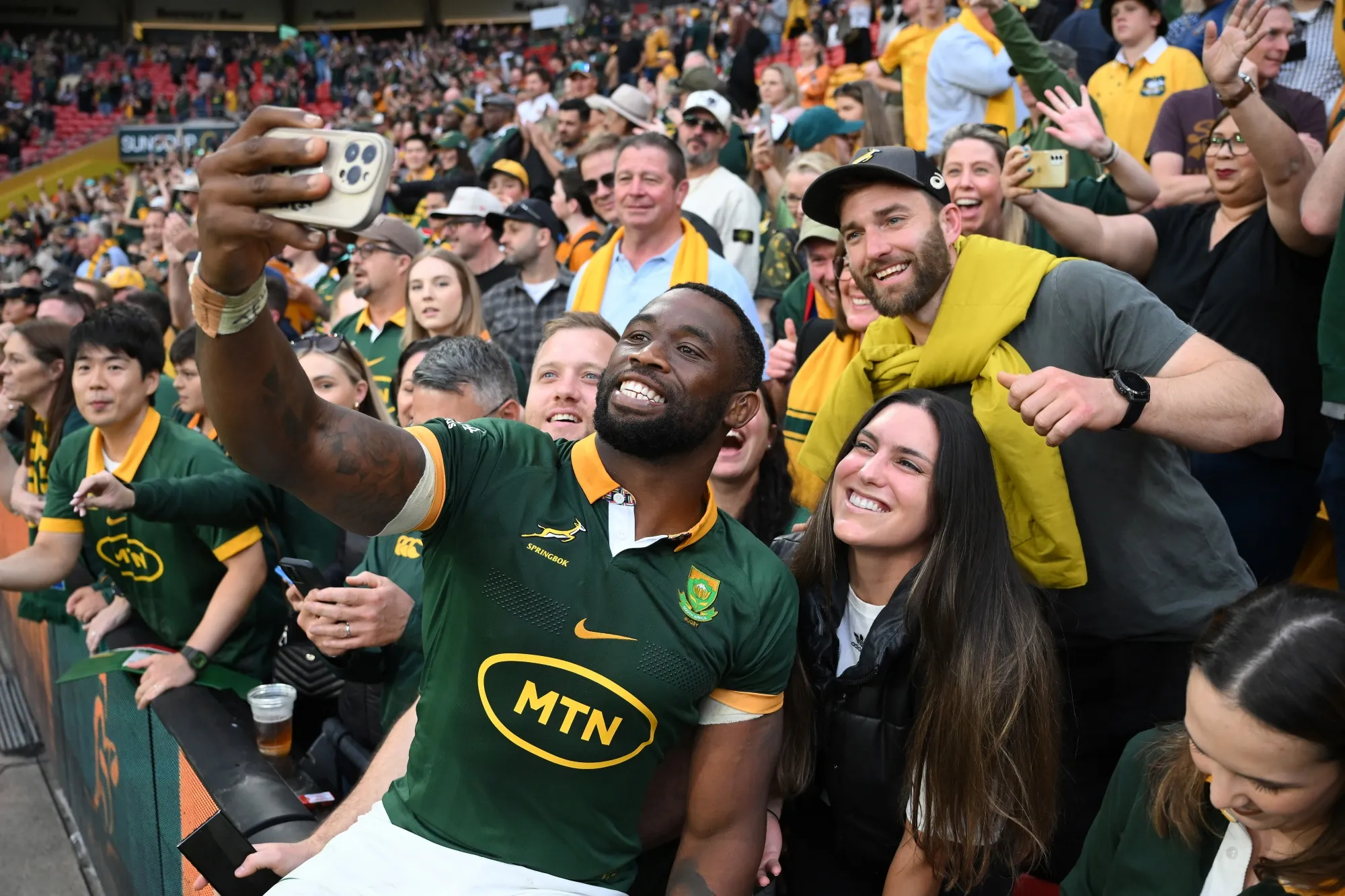 南非橄榄球队的西亚·科利西在澳大利亚布里斯班与球迷合影,拍摄于八月的橄榄球锦标赛对阵澳大利亚华莱士队的比赛后。
