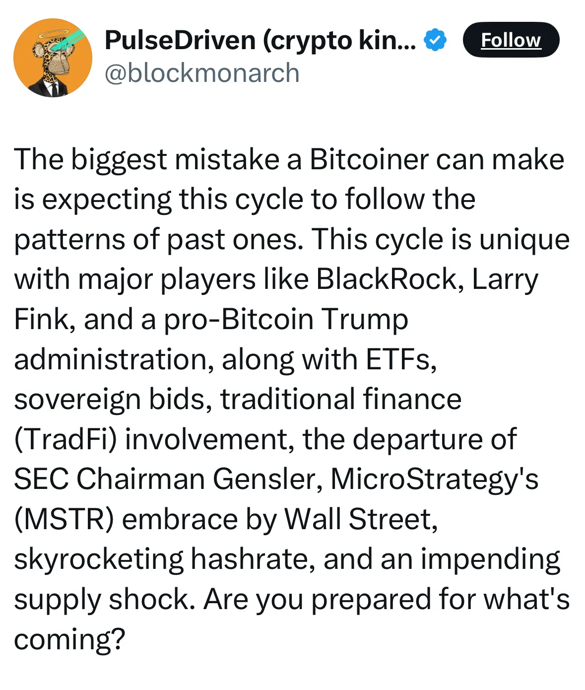 来源:@blockmonarch](https://x.com/blockmonarch/status/1866398475568705849)许多传统金融公司已经参与了使用区块链技术的试点项目。摩根大通正在使用自己的区块链,并探索代表银行存款的存款代币。州街银行已经支持数字资产交易所交易基金。BNY正在为提升加密托管服务做好准备。