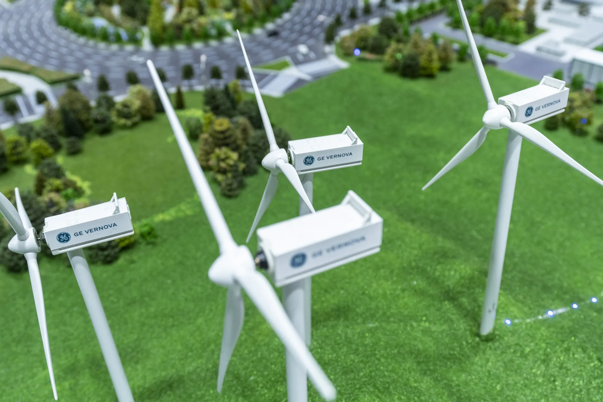 GE Vernova 风力涡轮机的模型。摄影师:Qilai Shen/BloombergGE Vernova Inc. 的负责人,该公司制造风电场和燃气发电厂的设备,表示运行数据中心的电力需求使化石燃料优于可再生能源——至少目前是这样。